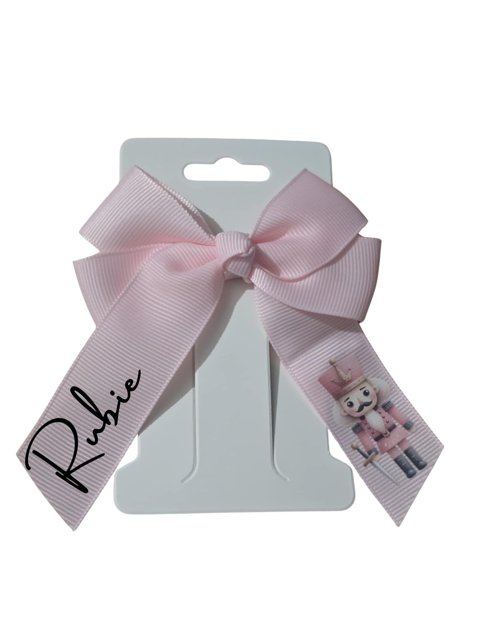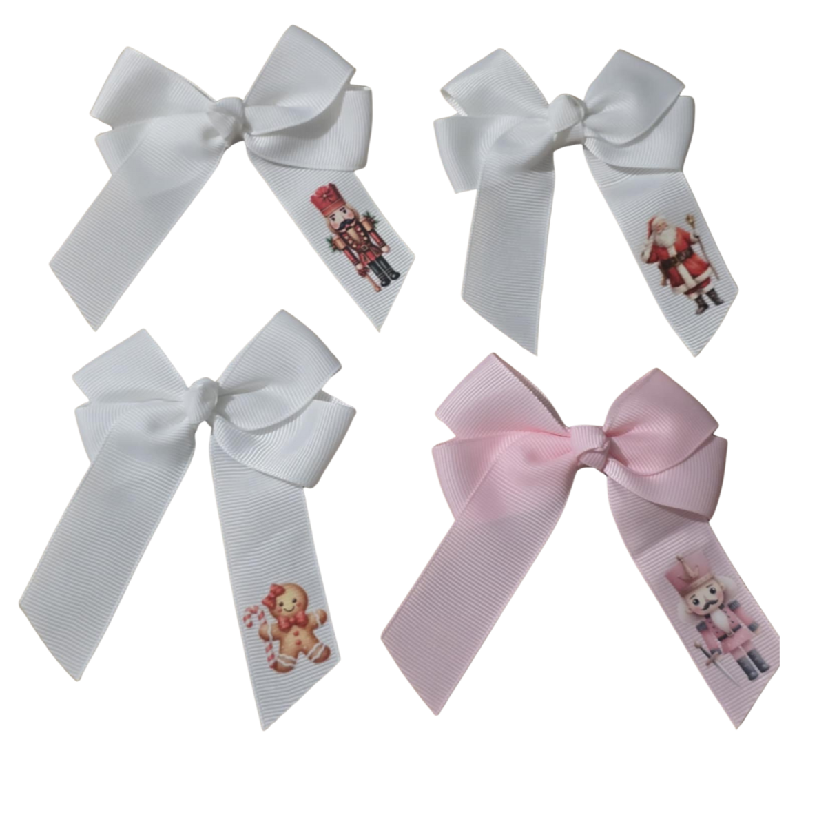 Available in classic colours such as Red, White, and Pink, each bow can be customised with festive designs including Reindeer, Reindeer in a Christmas hat, Gingerbread Man, Father Christmas, Pink Nutcracker, Santa's Sleigh, Snowman, and Red Nutcracker.